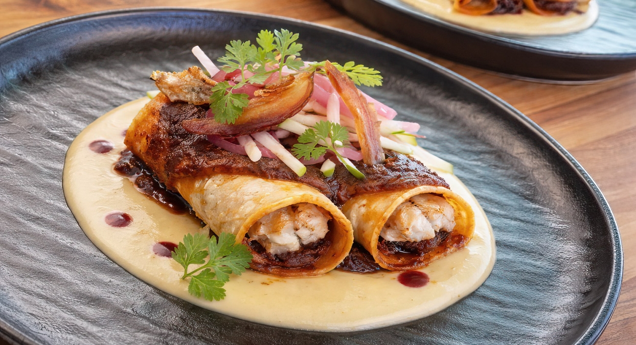 Add a spoonful of mole, then top with rockfish pieces.
