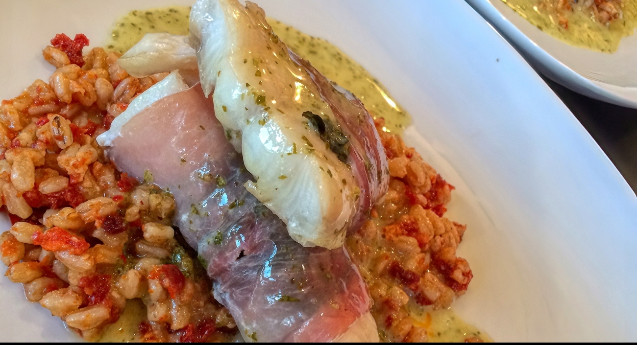 Sear halibut 2 minutes per side until prosciutto begins to crisp.