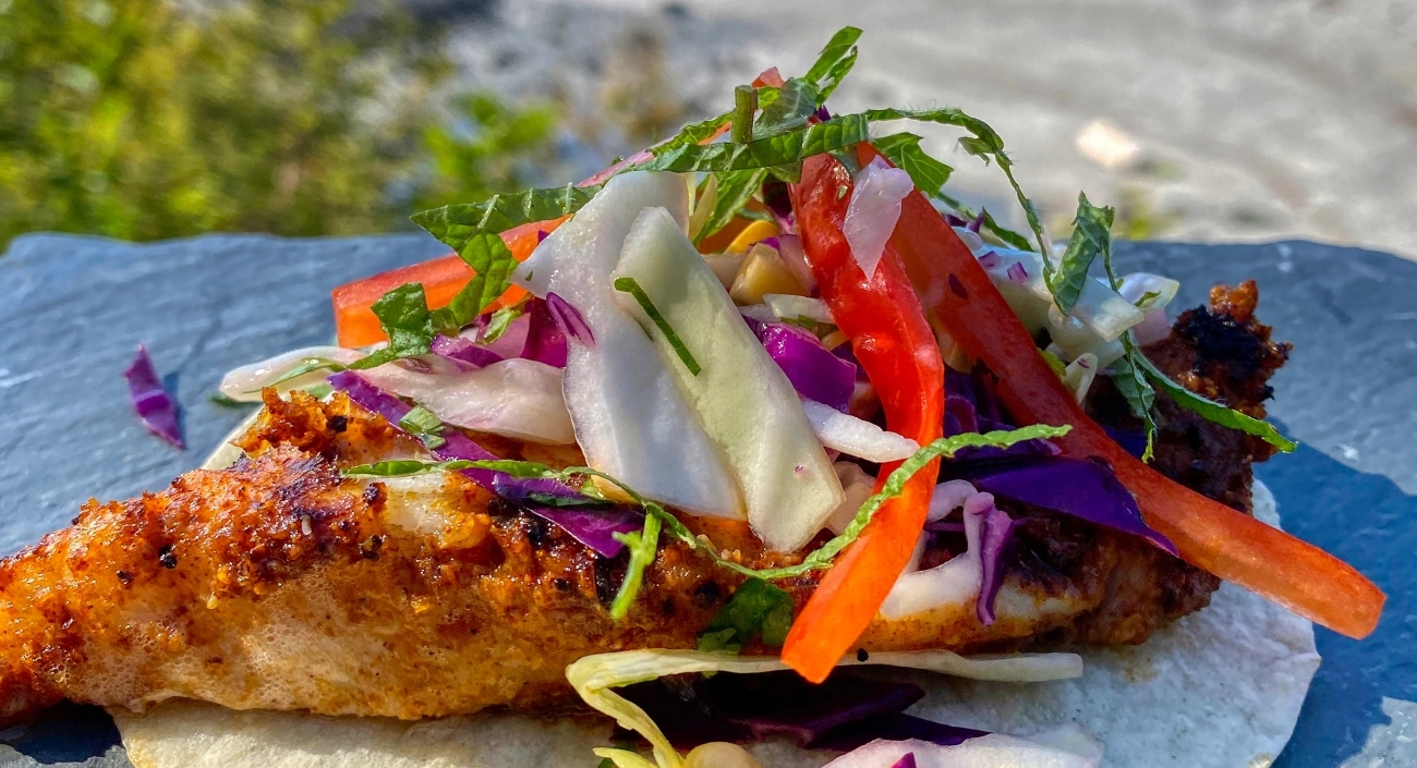 Fill tortillas with blackened rockfish, top with apple slaw. Optional: garnish with lime wedges or fresh herbs.
