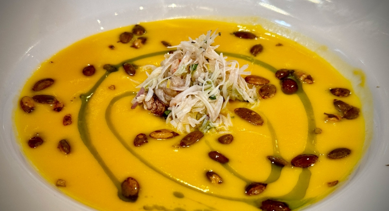 1. Ladle hot kabocha soup into shallow bowls.